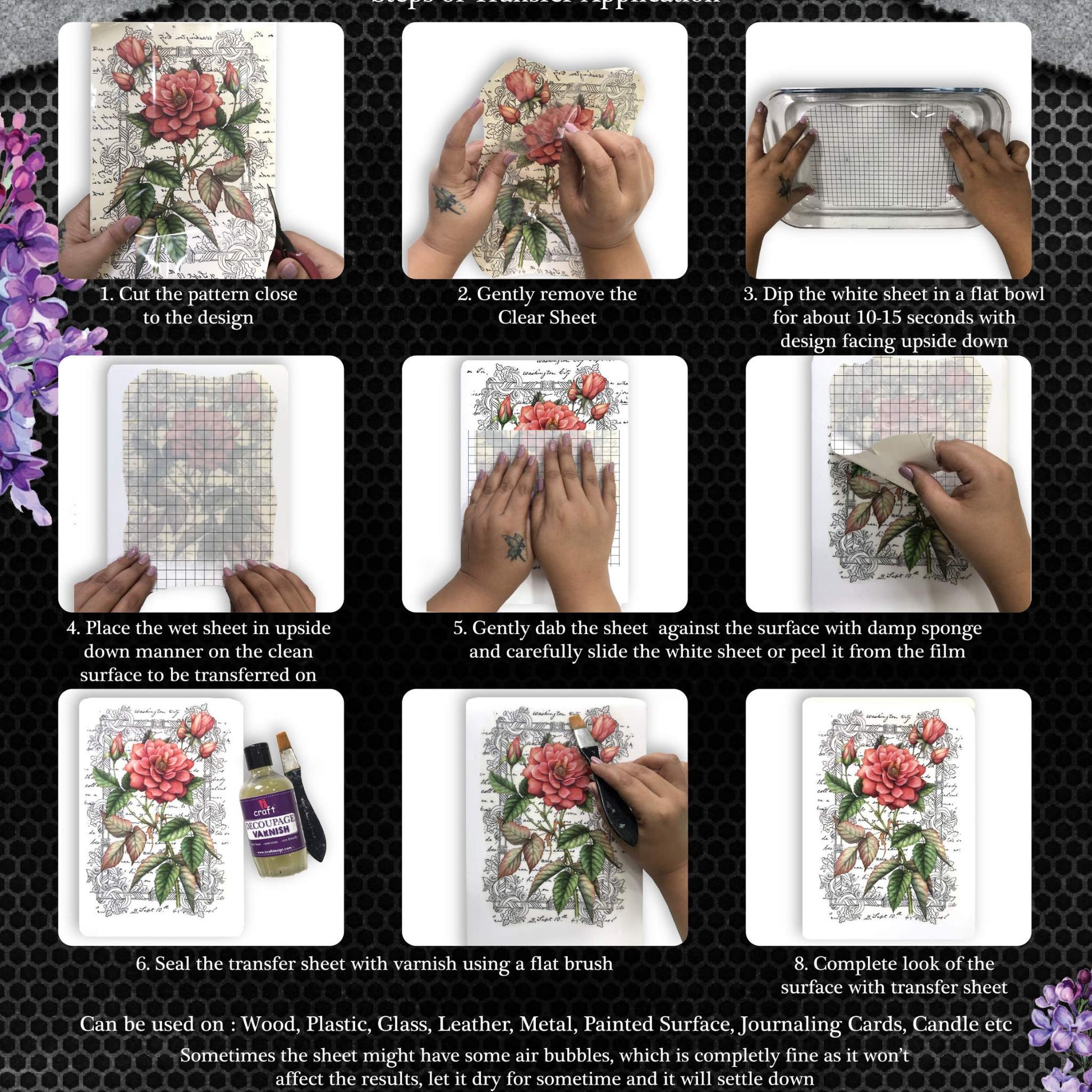 4.Place the Wet Sheet in Upside Down Manner on The Clean Surface to Be Transferred On, 5. Gently Dab the Sheet Against the Surface with Damp Sponge and Carefully Slide the White Sheet or Peel It from The Film.6. Seal The Transfer Sheet with Varnish Using a Flat Brush.7. Complete Look of The Surface with Transfer Sheet